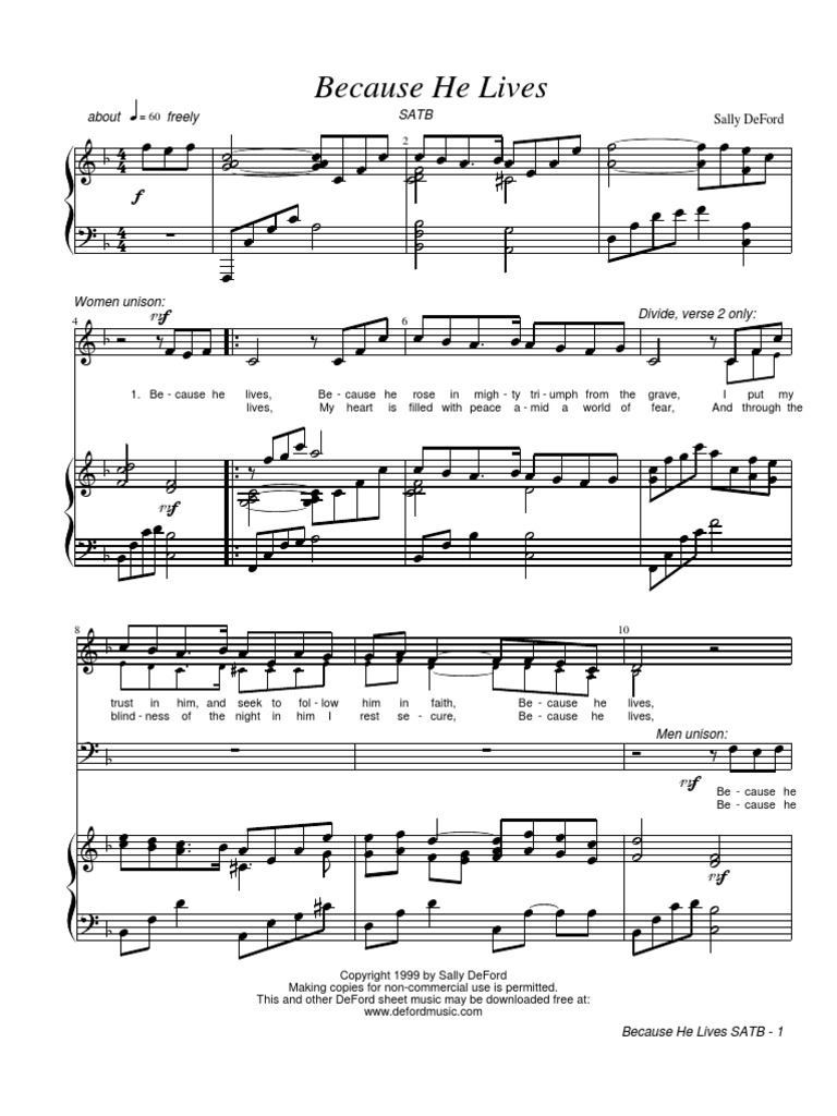 Free Printable Because He Lives Sheet Music - Download the sheet music for because he lives by praisecharts band / arr. Find your perfect arrangement and access a variety of transpositions so. Music notes for score sheet music by bill gaither: Contains printable sheet music plus an interactive, downloadable digital sheet music file. Leadsheets typically only contain the lyrics, chord symbols and melody line of a song and are rarely more than one page in length. The arrangement code for the composition is mlc. * not all our sheet music are transposable. Available at a discount in the digital sheet music collection: Because he died for my sins, defeated death, and rose again, i can completely trust him. 10 contemporary christian easter songs. Web free download because he lives music sheet with intermediate difficulty in best music sheet notes website. Contains printable sheet music plus an interactive, downloadable digital sheet music file. Web download and print because he lives sheet music for easy piano by gloria gaither from sheet music direct. Available at a discount in the digital sheet music collection: Because he. Contains printable sheet music plus an interactive, downloadable digital sheet music file. The arrangement code for the composition is mlc. Leadsheets typically only contain the lyrics, chord symbols and melody line of a song and are rarely more than one page in length. Minimum required purchase quantity for these notes is 1. * not all our sheet music are transposable. Web print and download because he lives sheet music by john purifoy arranged for piano. Contains complete lyrics publishing administered by: Contains printable sheet music plus an interactive, downloadable digital sheet music file. Available at a discount in the digital sheet music collection: Available at a discount in these digital sheet music collections: Auf, auf, mit hellem schall for flute, horn & strings (bwv 128 no 3) flute, french horn and strings / intermediate. Because he died for my sins, defeated death, and rose again, i can completely trust him. Web because he lives god sent his son they called him jesus, he came to love, heal and forgive; Contains printable sheet music. Web gloria gaither because he lives sheet music arranged for lead sheet / fake book and includes 1 page (s). When this song was released on 08/28/2018 it was originally published in the key of. In order to check if 'because he lives' can be transposed to various keys, check notes icon at the bottom of viewer as shown in. Web because he lives god sent his son they called him jesus, he came to love, heal and forgive; Instrumental solo in bb major. Because he lives i can face tomorrow, because he lives all fear is gone, because i know, i know who holds the future, and life is worth the living, just because he lives. Web free download. Because he lives i can face tomorrow, because he lives all fear is gone, because i know, i know who holds the future, and life is worth the living, just because he lives. Catalog sku number of the notation is 178908. Web print and download because he lives sheet music. Because he lives digital sheet music. Minimum required purchase quantity. Web download and print in pdf or midi free sheet music for because he lives by misc praise songs arranged by sidorchukandrew for violin (solo) The arrangement code for the composition is mlc. When this song was released on 08/28/2018 it was originally published in the key of. Contains printable sheet music plus an interactive, downloadable digital sheet music file.. Minimum required purchase quantity for these notes is 1. Because he died for my sins, defeated death, and rose again, i can completely trust him. Contains printable sheet music plus an interactive, downloadable digital sheet music file. Available at a discount in these digital sheet music collections: Web because he lives sheet music pdf (praisecharts band / arr. Contains printable sheet music plus an interactive, downloadable digital sheet music file. Web download and print in pdf or midi free sheet music for because he lives by misc praise songs arranged by sidorchukandrew for violin (solo) Catalog sku number of the notation is 178908. Minimum required purchase quantity for these notes is 1. Leadsheets typically only contain the lyrics,. Web print and download because he lives sheet music by john purifoy arranged for piano. Music notes for score sheet music by bill gaither: Web because he lives digital sheet music. Instrumental solo in bb major. Web download and print in pdf or midi free sheet music for because he lives by misc praise songs arranged by aimless19 for piano (solo) He lived and died to buy my pardon an empty grave is there to prove my savior lives; 10 contemporary christian easter songs. Read online preview of because he lives digital music sheet in pdf format. Available at a discount in these digital sheet music collections: Web print and download because he lives sheet music. Web gloria gaither because he lives sheet music arranged for lead sheet / fake book and includes 1 page (s). Web free because he lives by misc praise songs sheet music | download pdf or print on musescore.com. Minimum required purchase quantity for these notes is 1. Catalog sku number of the notation is 178908. Contains printable sheet music plus an interactive, downloadable digital sheet music file. Leadsheets typically only contain the lyrics, chord symbols and melody line of a song and are rarely more than one page in length. Web because he lives digital sheet music. Contains complete lyrics publishing administered by: The style of the score is gospel. Web because he lives sheet music pdf (praisecharts band / arr. Minimum required purchase quantity for these notes is 1. Catalog sku number of the notation is 178908. Contains printable sheet music plus an interactive, downloadable digital sheet music file. Web because he lives digital sheet music. * not all our sheet music are transposable. Music notes for sco